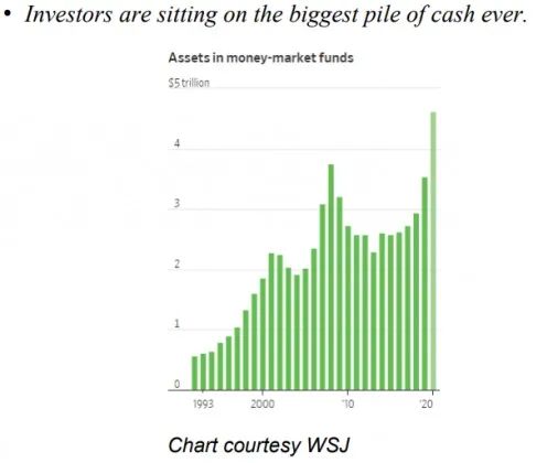 丹·泰皮罗认为,全球现金流基本上已经达到历史最高水平,因此很可能会流入到黄金和比特币市场。一般来说,当股票、证券和普通商品价格暴跌时,货币市场中的流动现金就会转移到避险资产。他还在推特上发布了一张华尔街日报的分析图(如下所示),其中明显看出投资者们现在坐拥史上最多的现金: