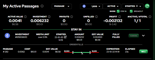 如果订单变成图中FULLY FILLED状态,表示完全成交了。点击右侧三角箭头图标将会出现订单的详细信息,包括价格范围,具体的价格区间,订单已经持续的时间(按秒计时),订单开始的时间,预估价值等。另外,还有一个绿色SELL按钮。这就涉及到Passage的另一个特色Vault了,其主要功能是为Passage提供流动性,这里可以参考GMX。成交状态订单的预估价值会随着标的价格变化实时波动,比如一个Stayin的订单在开单2小时后,标的价格便开始波动,虽然还未超出你的价格区间但是你预判标的价格将会很快超出区间范围,此时便可以点击SELL按钮止损。Breakout订单同理,比如订单成交2小时后标的价格波动性趋缓,此时预估价值尚未高于你的订单价值的话,你预判未来价格波动不会超出区间,便可以点击SELL按钮止盈。实际的预估价值会根据标的价格,开单方向以及开单时间相互影响,并实时变化。而卖出这个选项则是由Vault来提供流动性,事实上在目前的测试网期间,在购买Passage时Vault也在根据算法发挥作用。未来主网上线后Vault也将对用户开放,为用户提供被动收益的可能性。